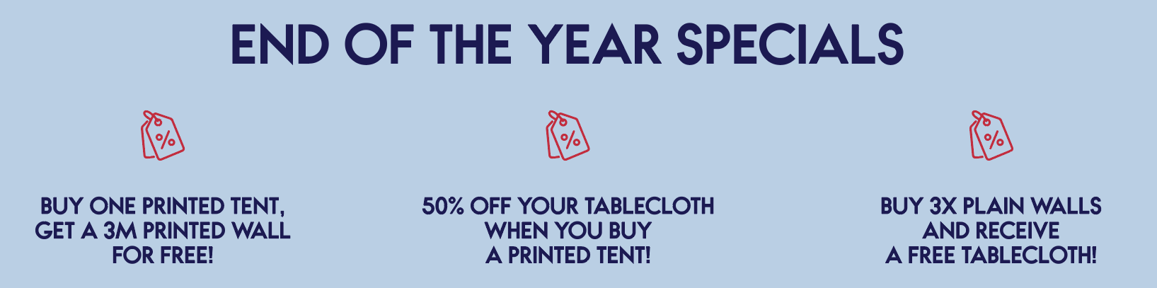 50% OFF YOUR TABLECLOTH WHEN YOU BUY A FULLY PRINTED TENT